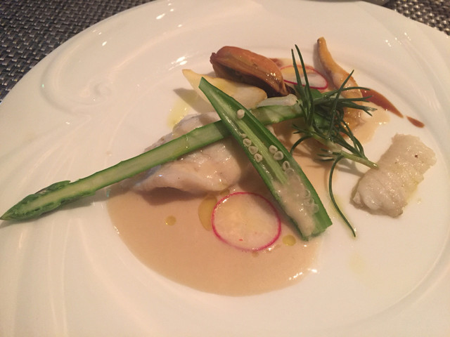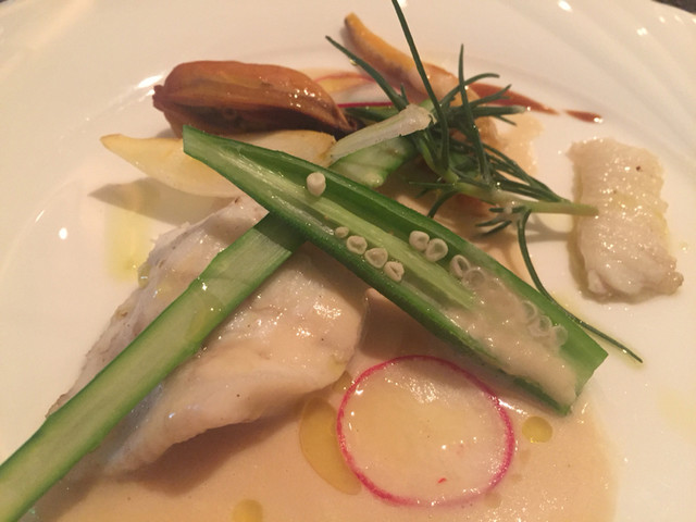 石鰈はローズマリーと共に火入れされ、ふわりと柔らか、えんがわも上品です。ホヤは内蔵ソースと一緒に味のコントラストを付けています。燻製のムール貝が味が濃厚で、ぷりっと大ぶりで美味でした。