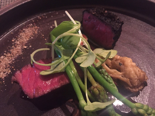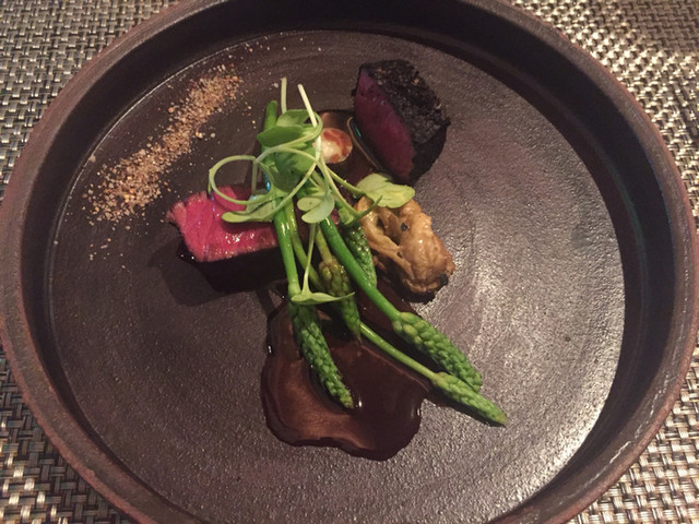 夏の蝦夷鹿!火入れが良く赤みが美しいこと、もちろん柔らかいです。骨からとった赤ワインのソースも秀逸。1つの切り身には焼きなすの皮を細かくしたものを纏わせるという手の込んだものでした。フランス産野生のアスパラソバージュも夏を感じさせます。