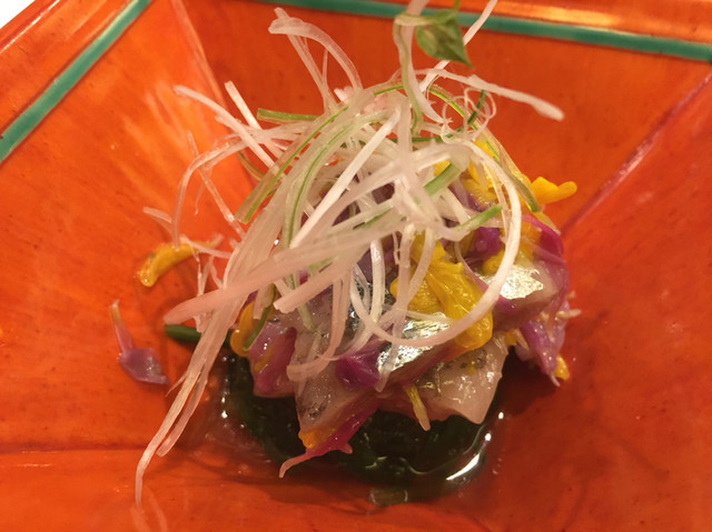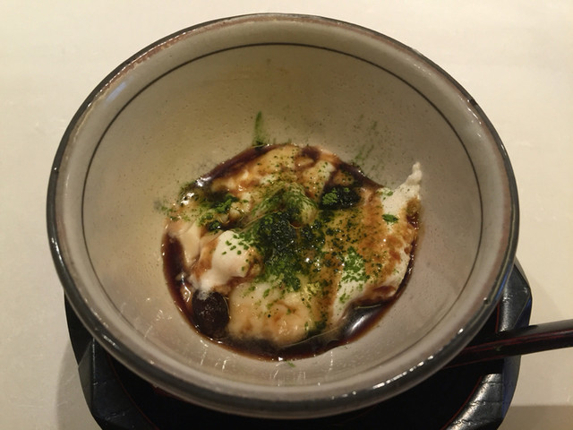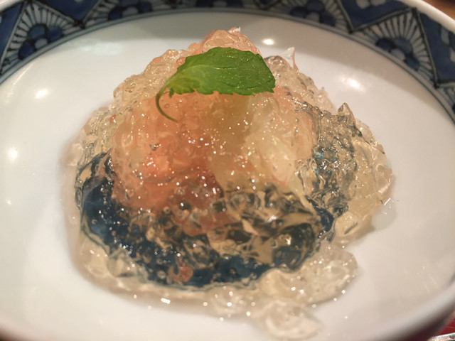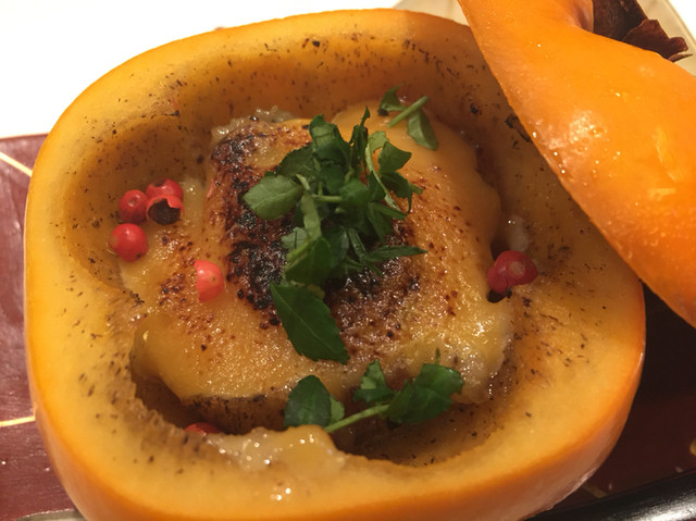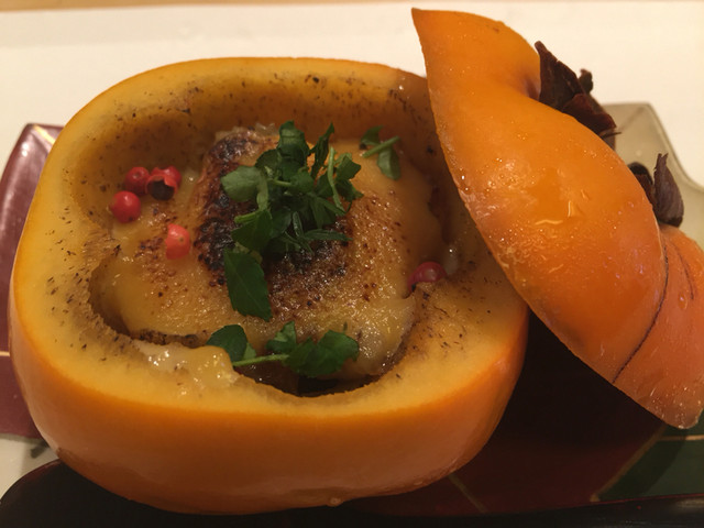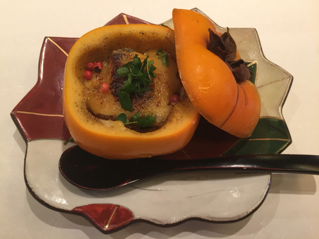 なんととんちの効いた(笑)!柿をくり抜いた中に一粒の牡蠣が。西京焼きになっています。ボール状の柿の果肉もコロコロ入ってます。いくら名前の音が同じとはいえ、この異素材のテイストの相性は?と思いましたが、西京味噌のまろやかで少し甘みのあるコクが、これらを繋いでくれてよく合っていました。美味しい!