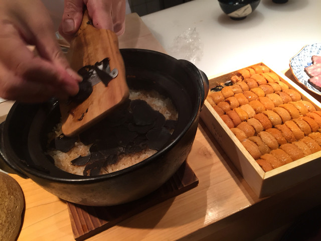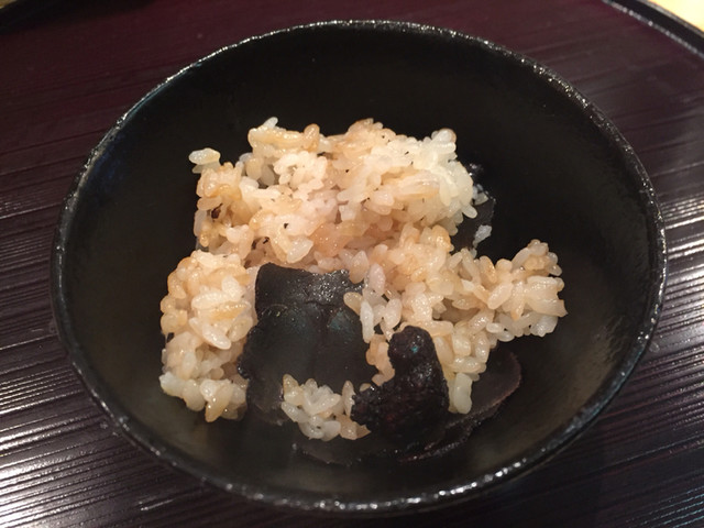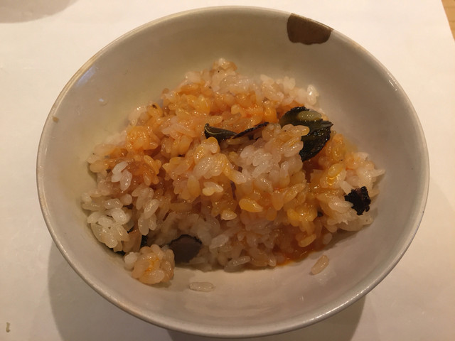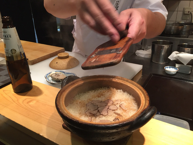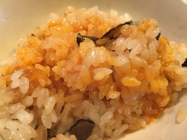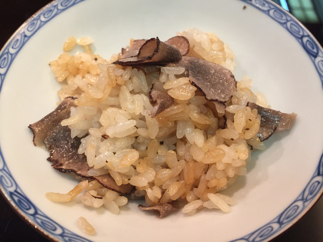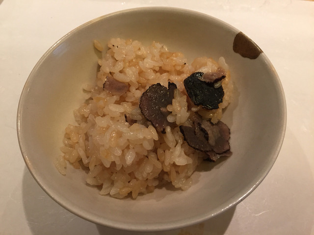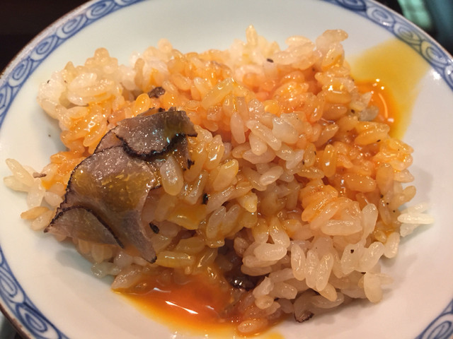 トリュフご飯は以前いただいたので、とても楽しみにしていました。目の前ですりおろされるトリュフの香りの魅惑的なこと!クラクラします。途中から群馬県の地鶏の卵をかけて更に美味しさがパワーアップ!お腹いっぱいだけどいつまでも食べていたくなる美味しさ…。