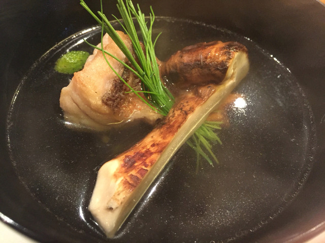 豪快に大ぶりな松茸と鯛の旨味たっぷりの汁椀。松茸の季節が始まったのですね〜。香りがいい!滋味深い味わいが身に沁みます。