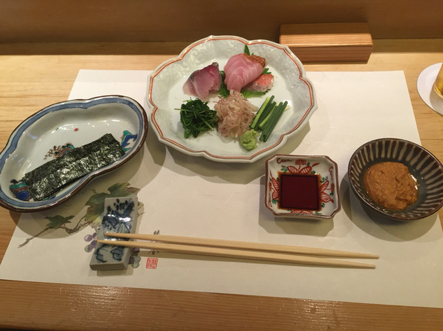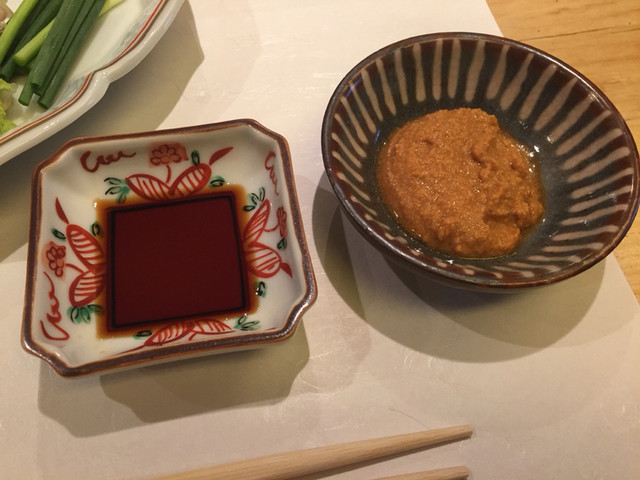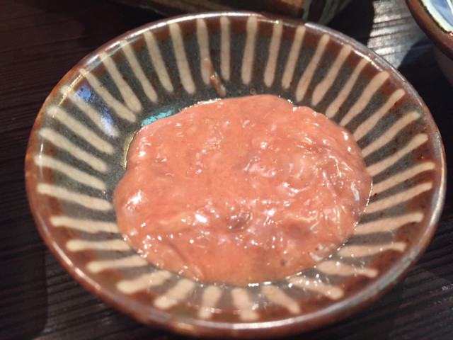 お刺身には醤油と肝醤油を付けます。たっぷりの薬味が添えられているので、それと一緒に海苔で巻いて手でパクッと。なんという演出でしょう!身はプリッとした弾力と甘みがあり、新鮮さを感じます。肝醤油はもうそれだけで酒のアテになりそうなくらいの旨味がありました。このアトラクション性には虜になりましたね。