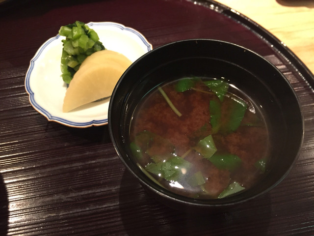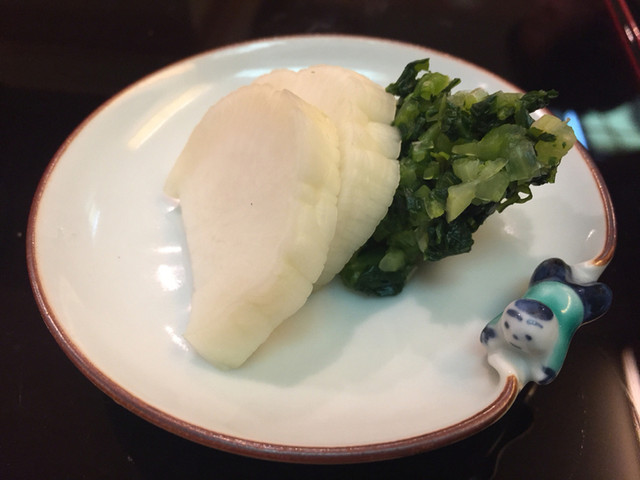 赤出汁には藻屑蟹が。出汁がよく出るそうです。漬物の器が可愛かった。