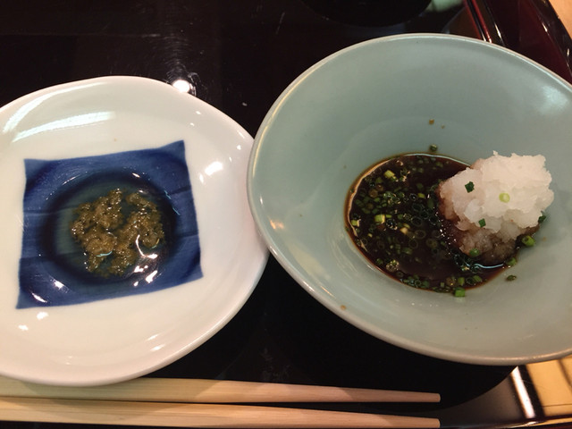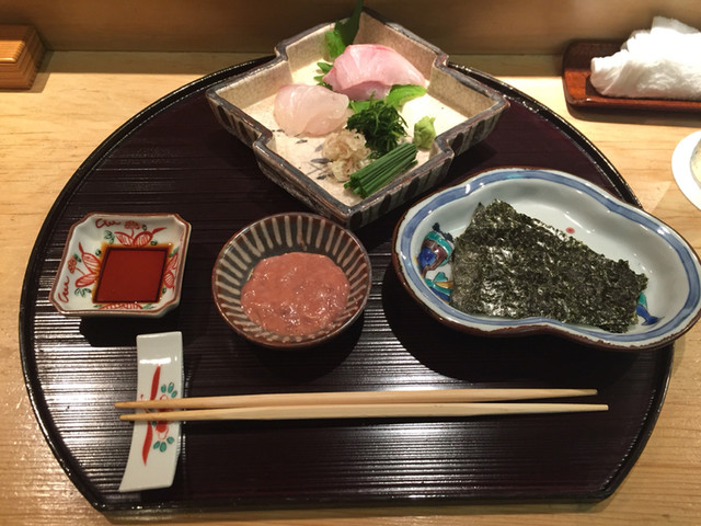 ランチでもいただいた、海苔と薬味で巻いていただくお刺身。この肝醤油がとっても美味しくてクセになります。