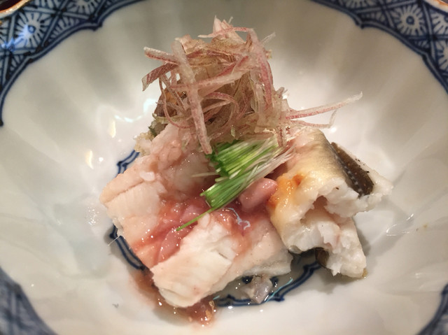 しっとりと仕上がった鱧に酒盗が合う!焼きナスや茗荷も季節を感じさせて。