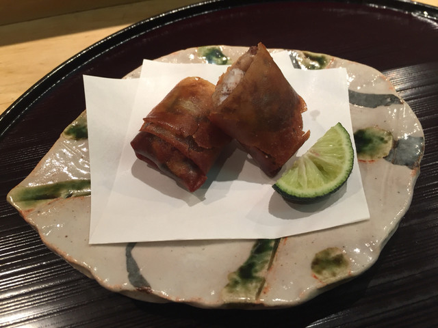 今回はあん肝ではなく塩辛でいただくお刺身。はらまささんのお刺身は一切れが大きいんですよー。身が厚くて甘くて、海苔で巻いていただくというアトラクション性もあって楽しいのなんのって。絶対日本酒が欲しくなるでしょ。主人はここで生ビールから日本酒にシフト。私も味見させてもらったけれど華やかフルーティな香りで美味しかった(o^^o)。