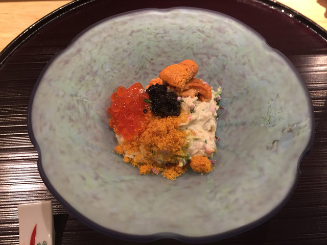 でもこれがさらに進化しているような〜。毛ガニは蟹味噌もふんだんに入っていて濃厚。青のりも入っていて香りがいいんです。そして惜しげも無く雲丹、いくら、カラスミ、キャビアといったプチプチ系卵がこれでもかというくらいにオン。これは反則技でしょ〜。もう「やばい、やばい」言いながら食べてしまいました。美味しすぎる!!あー、夢に出てきそう(笑)。わたしがあまりにも幸せそうに食べてるので主人が半分くれました(笑)。マイレビュアーさまが「旦那さん、優しい〜」と一言(o^^o)。はい、こんなに食べちゃって贅沢過ぎます^_^。