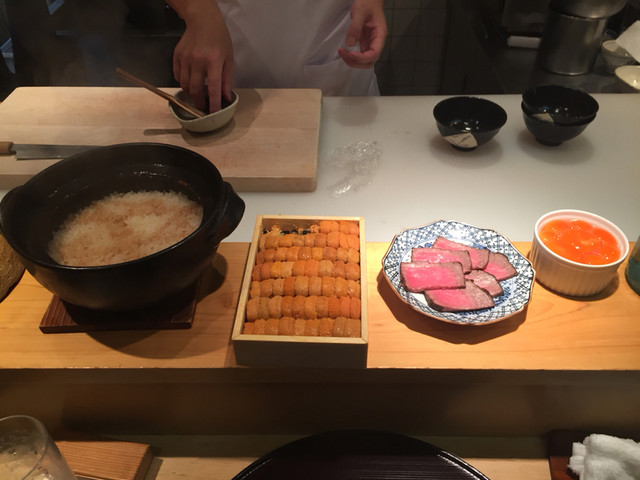 前にいただいたのはトリュフご飯に卵の黄身をかけていただいたのですが、今回はなんとそれに加えて雲丹とローストビーフをトッピングできると!なんかこれらの食材をトッピングなんて軽々しい名前で言っちゃうところがもう笑えます。もちろん全部のせでお願いしました。たらっと醤油たれをかけて。