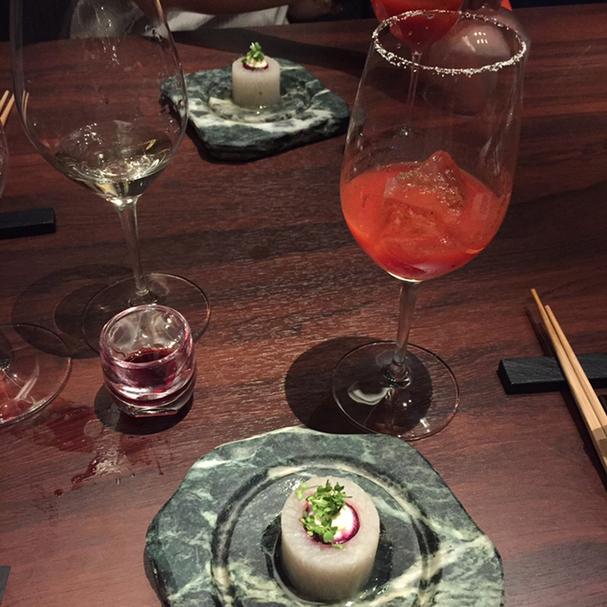 スモークのもくもくのガラスを開けるとふわっと桜チップによるスモークのいい香り。中になんとしみしみの大根が!ビーツのソースとスネ肉のリエットが中に仕込んであり手間がかかっているのが伝わりました。スネ肉の肉質と大根が非常によく合います。