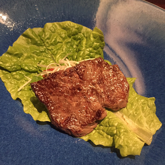「王道」とはいわゆる「韓国焼肉に立ち返る」という意味なんです。ブルーの鮮やかなお皿にサンチュ、韓国の味付けの辛味(すみません、名前を失念)ランプを焼いていただき熱々をくるくるっと巻いていただきます。たしかに王道のおいしさ笑。