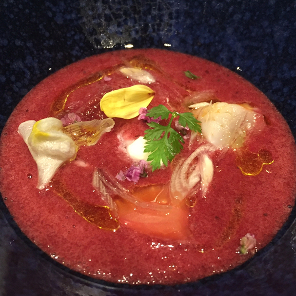夏らしいガスパチョ。トマトだけでなくスイカとブルーベリーが入り、果実味も感じていい香り。北海道の車海老のミキュイなども入り、アミューズというよりは立派な前菜になっていました。
