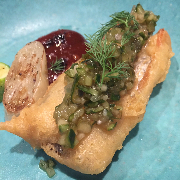 太刀魚のベニエはあっつあつ!時間を見て作られているのがすごい。これに山形の出汁を乗せてあり、ひやあつな美味しさ。添えられた野菜も夏らしくてよかった。お皿の色も綺麗なターコイズブルーで素敵でした。