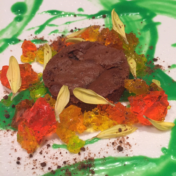 パレットを模したお皿に芸術的なデザート。ガトーショコラにゼリーを散らして、脇にはライムのシャーベットが。緑色の絵の具のように見えるのはなんとホワイトチョコレートでとても美味しかったです。