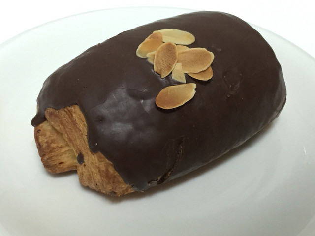 いわゆるパンオショコラとは全く違う、ヒヨシヤ版、昭和のパンオショコラ。クロワッサン生地の上にチョココーティングとスライスアーモンド。中にもチョコクリームがたっぷり。