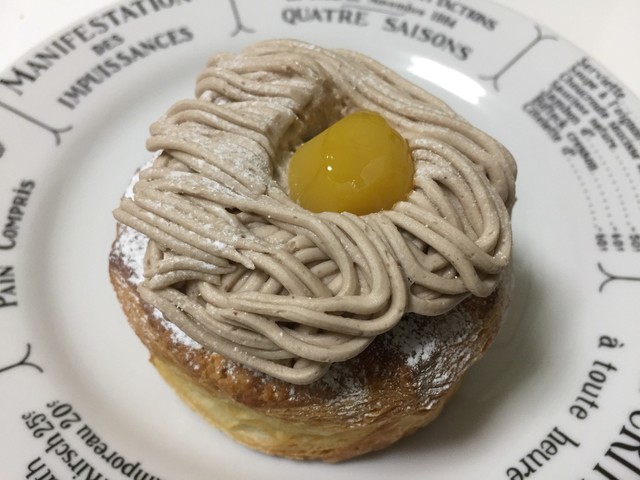 モンブランデニッシュ250円はサックサクのデニッシュ生地にカスタードクリーム、ホイップ、モンブランクリームがたっぷり乗ってます。外からはモンブランクリームしか見えなかったので、こんなにトリプルクリームになっているとは知らず、かなりレベルの高いスイーツパンで嬉しかったです。
