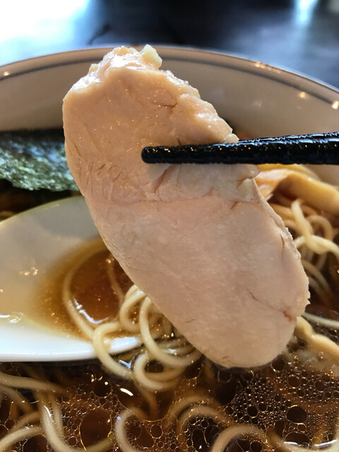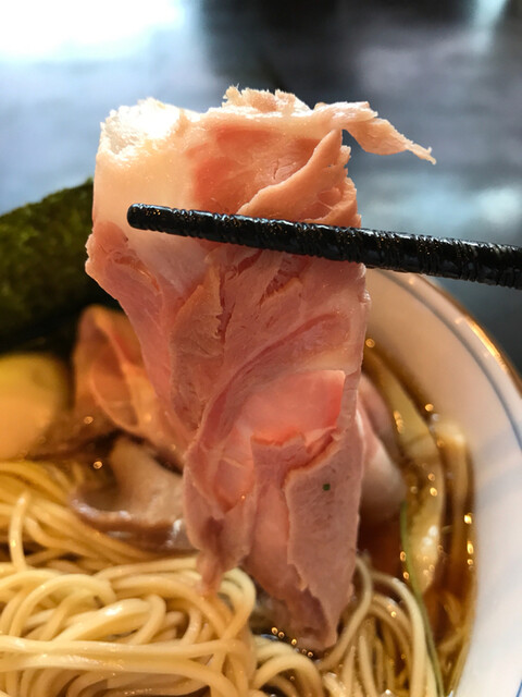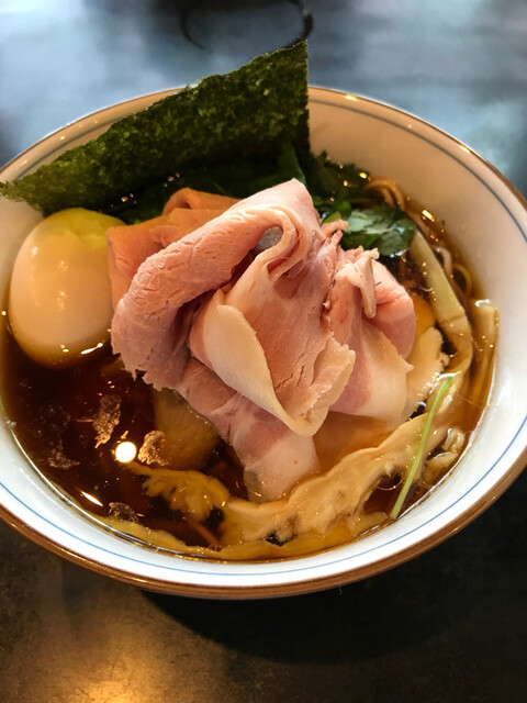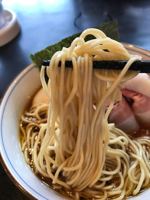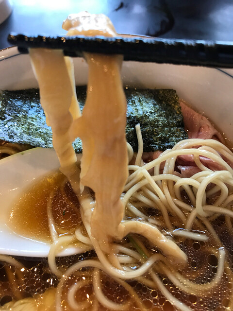 淡麗な透明に近い醤油スープが、ニボの存在を強調しています。