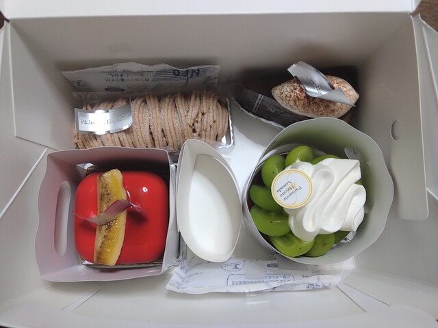 ガトーショコラ(620円)、シャインマスカットのタルト(850円)、モンブラン(650円)、ルナ(700円)をテイクアウト。