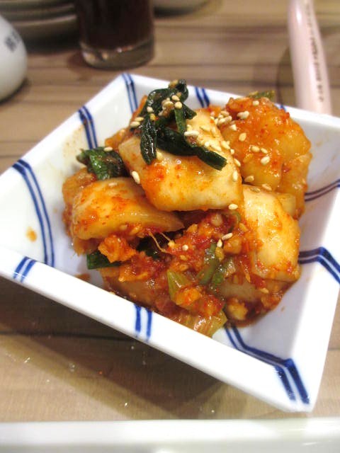「お通しはキャベツ、もやしナムル、キャロットラぺ、オニオン