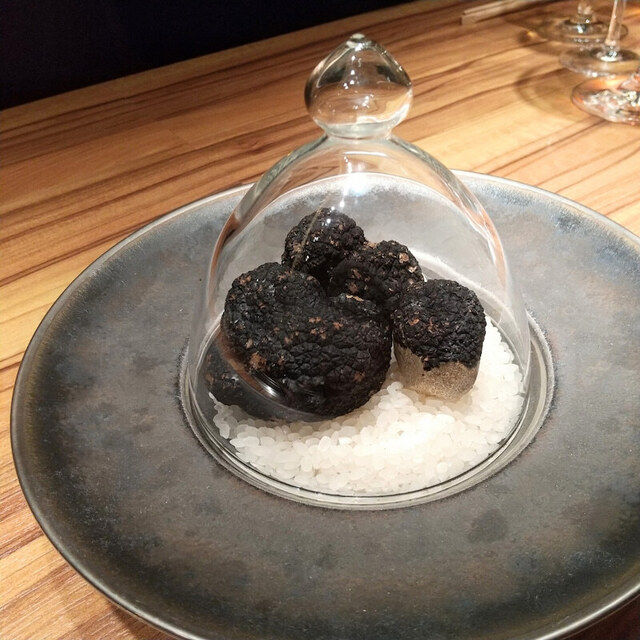 ご飯と卵、お肉の上にたっぷりトリュフをスライスし、