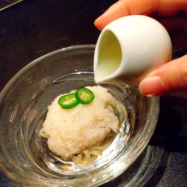 シャーベット状の出汁に宮崎の柑橘・へべすをかけて。