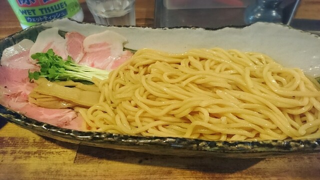 つけ汁は、ドロっとした濃厚な鶏白湯で魚介が効いていました。麺は太ストレート麺でした。冷水でしめられてあり、こしがありました。ちなみに熱盛りは不可でした。客に選択肢を与えないスタンス、嫌いじゃないです。トッピングは薄切りのレアチャーシューが五枚、シナチク、カイワレでした。