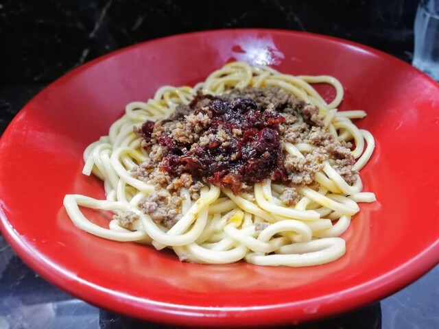 今回は、しんはんめんというメニューをポチりました。10分程で運ばれてきました。辛そうなまぜそばですね。よく混ぜてからいただきました。ラー油的な赤い汁が飛ぶので注意が必要です。かなりオイリーな印象を受けました。塩気はそんなにないですが、唐辛子系のスパイスがザクザク入っている感じでした。辛さはそこまで辛くなかったです。四川料理のような感じかな。麺はさすがの旨さでした。具は粗びきのミンチのみでした。やや物足りなさを感じましたが、値段は安かったです。