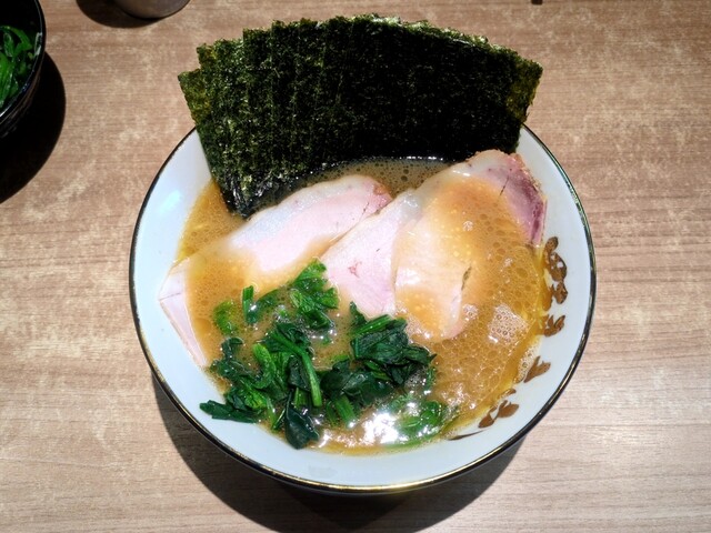 醤油のキレに豚骨の旨味とコクが豊かな濃厚醤油豚骨スープに別皿で提供お願いした旬の生ほうれん草が旨い!