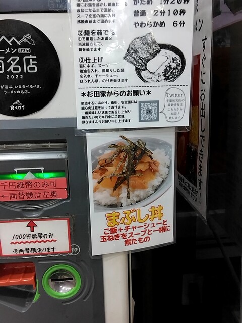 平日の今日は早起きして杉田家千葉祐光店に伺いました。AM5時ちょっと過ぎに店着、先客4名です。すっかり和風トッピングの虜となってしまい今日もラーメン並800円+和風トッピング100円、券売機メニューを見るとまぶし丼が目に飛び込んできて思わずまぶし丼200円もオーダーです。カウンターに座り好みを聞かれます。今日は全部普通でお願いしました。待つこと5分弱でしょうか、ご対~麺!あれっ海苔が5枚?デフォは3枚ですのでまぶし丼に2枚ついてる?まっいいかw 早速スープから頂きます。旨い!!!鰹節の旨味と醤油豚骨スープが最高に合いますね!更に梅を加えていくと酸味が加わります、これは旨いですよ。麺の固さは普通でお願いし、これはこれでいいですが、やっぱり固めの方が好みですね。スモーク効いたチャーシューは今日は1枚+端切れです。相変わらず旨いです!そしてまぶし丼!このスモーク効いたチャーシューと玉ねぎをスープと一緒に煮たものが旨くないわけありません、うまーい♪ 朝から結構なボリュームでしたがあっという間に完食です。入口券売機2台ありメニュー一緒かと思えば、右と左でサイドメニューとトッピングが違うんですね。右側のまぶし丼あった券売機には生ほうれん草、キャベツのトッピングあります。生ほうれん草はもうそろそろ終わりかな?次回はレギュラーに戻り生ほうれん草トッピングで頂きたいと思います。