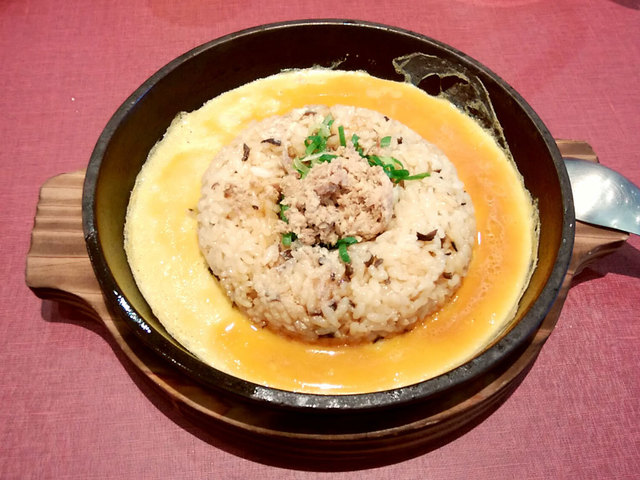 チャーハンは、テーブルに持ってきたときに従業員さんが熱した鉄の器の中に溶き卵を入れます。