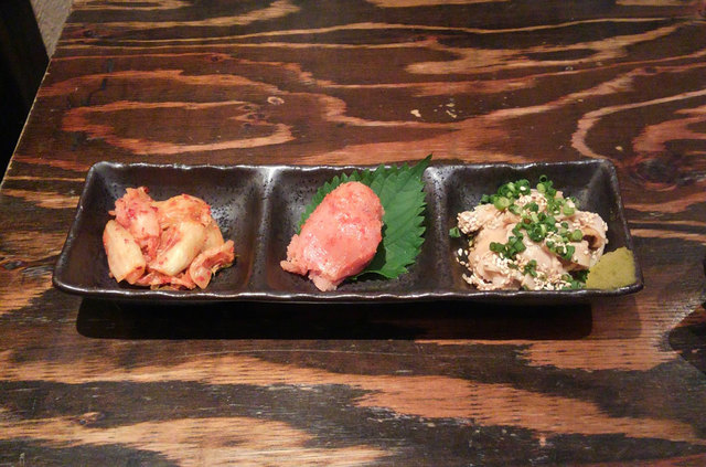 白菜キムチ・明太子・柔らか酢モツが出てきます。