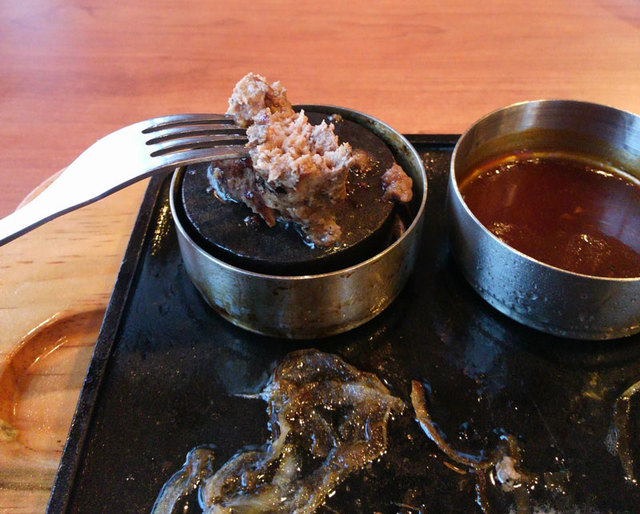ハンバーグの方ですが、周りが硬い焼き方になってますね。