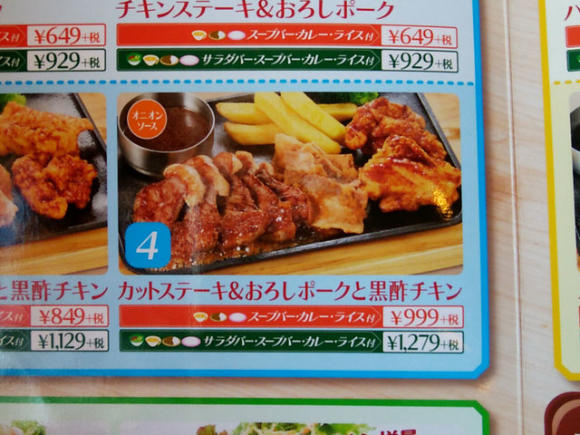 日替わりのランチメニューが4種類ある中の『カットステーキ&おろしポークと黒酢チキン』にサラダバーとドリンクバーを付けて食べ放題状態にします。