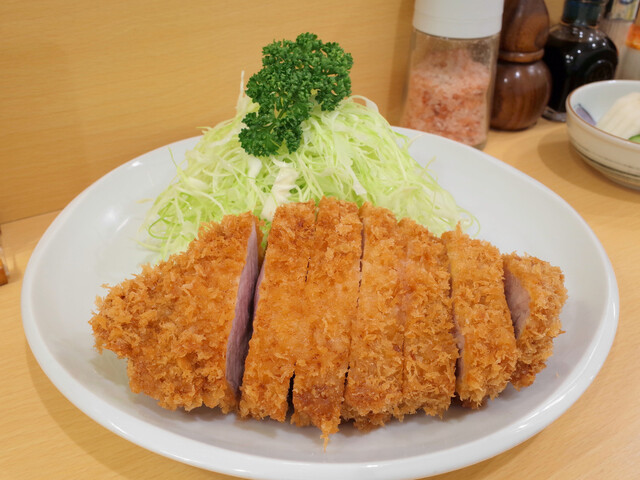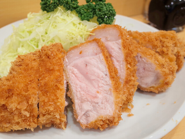 注文はオーソドックスにロースかつ定食を注文しました。入れ替えのタイミングで、一番最後の入店でしたので・・・出て来るまで結構待ったかな。出て来たロースかつは・・・美しい黄金色♪♪♪中を見ると薄っすらとピンク色!!!これはとても美味しそう♪♪♪