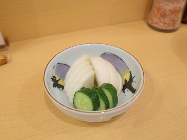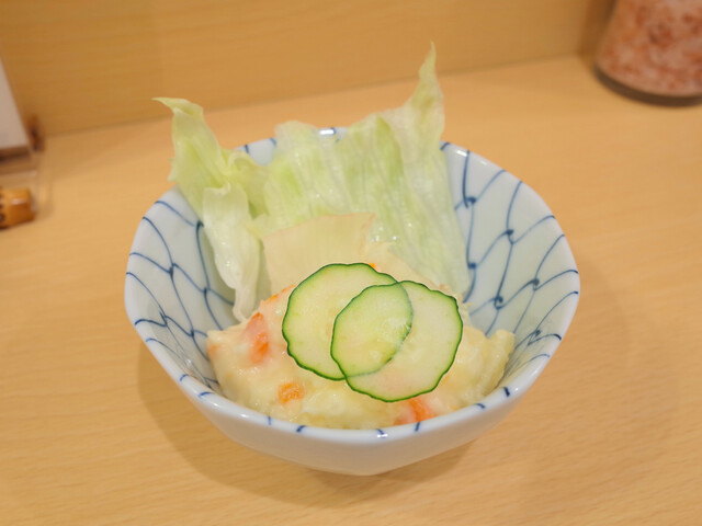 待ってるとお新香とポテトサラダが出て来ます。勿論、自家製で・・・美味し♪♪♪大根や蕪は程良く漬かってるし、キュウリは涼風(笑)♪♪♪ポテトサラダは自家製マヨネーズを使って居て、これまた美味し♪♪♪ビールは頼まなかったけど、絶対にビールを美味しく楽しめる味です(笑)♪♪♪