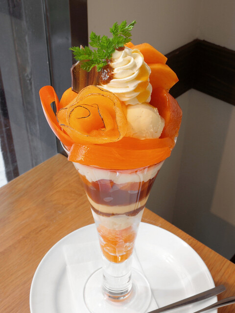 窓際の席に座って、注文を確認して・・・然程待つ事無くパフェの登場です。濃い橙色と云うか、洒落て言えばジャッロ・ジラソーレ(向日葵の黄色)って感じかな???色鮮やかで甘い香りが漂い、とても美味しそうです。