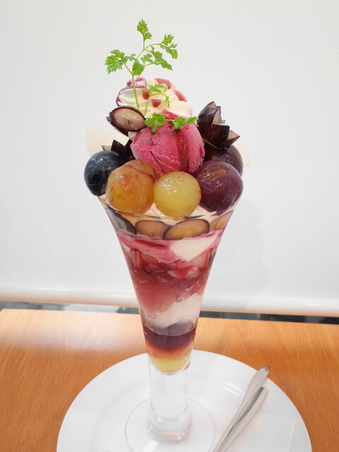 先日、メディアの取材で黒ぶどうのパフェを紹介した影響で、シャインマスカットのパフェを注文していたのは私だけでした。