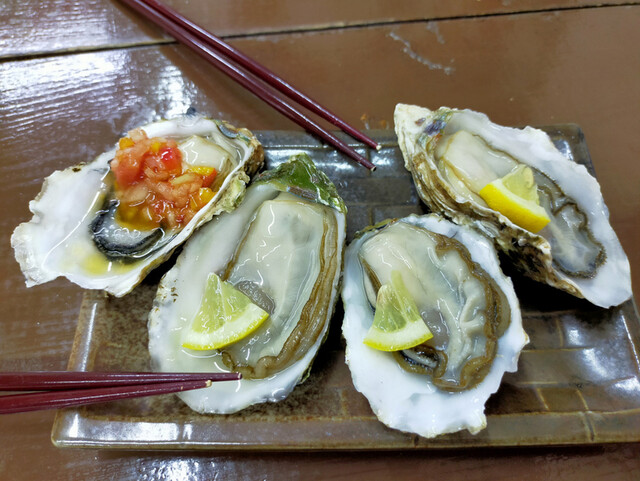 生牡蠣にサルサソースのようなものがのった牡蠣のカクテル、焼きガキも数をオマケしてもらいました。あまりに暇やったんかなぁ?お店の方に感謝です。パールロードで食べる牡蠣はどちらかというと大ぶりじゃなく中~小サイズが多いと思いますが、ちょうどいい中~サイズでカキが堪能できました。美味しかったです。気持ちもみたされました。ありがとうございました
