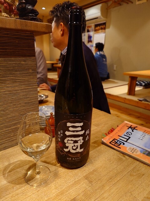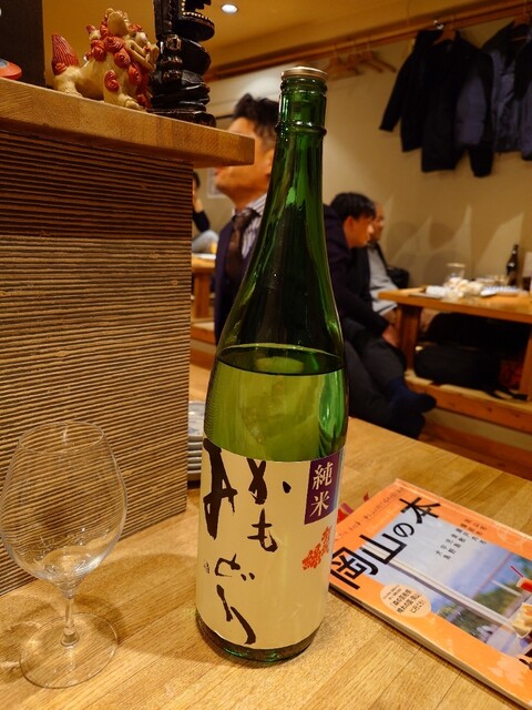 まずはビール、そして刺盛りを注文。確かに刺盛りが出てくるまでに1時間はかかったが、特に気にすることもなく、カウンターに置いてあった岡山の観光ガイドブックを読みながら、ビールから、女将さんおすすめの日本酒を次から次えと呑みまくる。