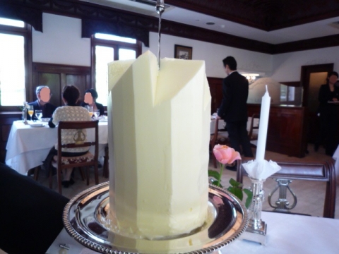 この巨大なバタータワーから上に突き刺さっている剣のようなナイフで大きくカットしてテーブルに置いてくれます。