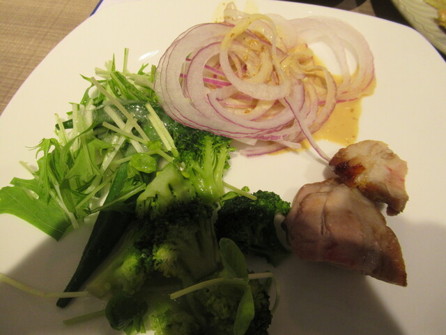 ご飯(玄米)、刺身(まぐろとイカ)、焼魚、だし巻玉子、味噌汁、寄せ豆腐、などをいただきました。あと野菜は自分に必須なので、サラダも多めにとってきて、いただきました。