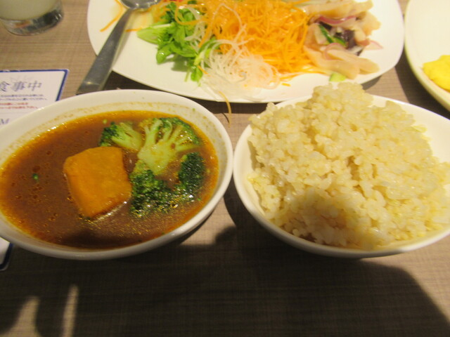 玄米をもらい、スープカレー自体に具はないので、蒸し野菜のかぼちゃとブロッコリーを追加。