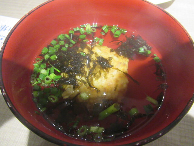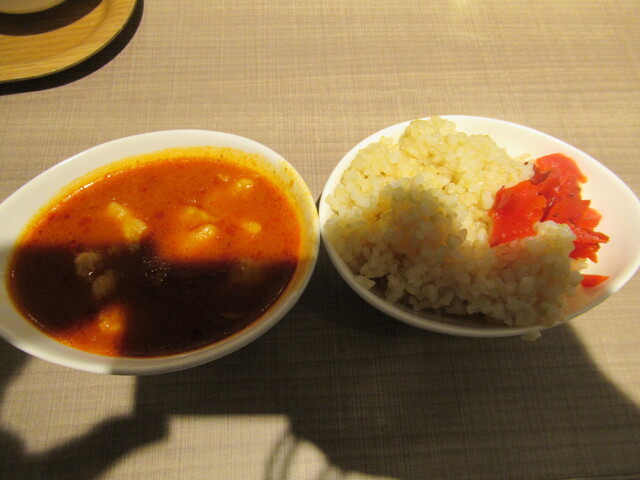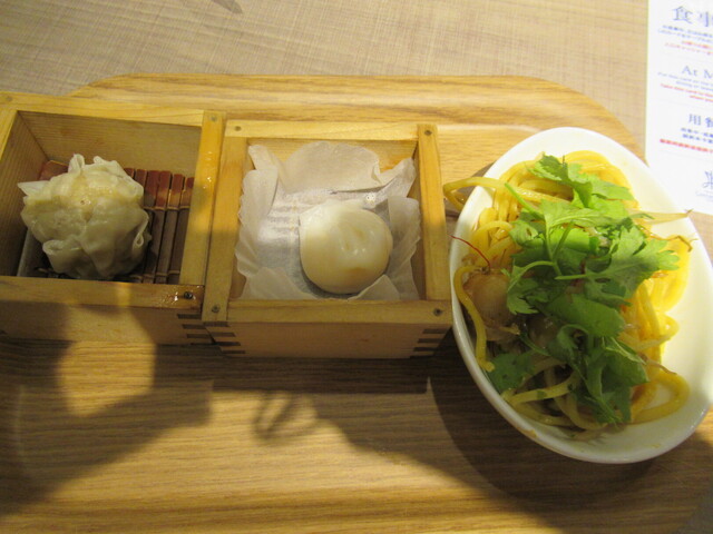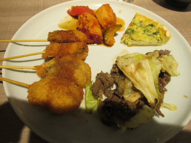 うにぎり(うにご飯の焼きおにぎり)の茶漬け、エスニック焼きそば、点心(シューマイとエビ餃子)、チキンレッドカレー、串揚げ(ナスの肉詰め、鰤)などをいただきました。