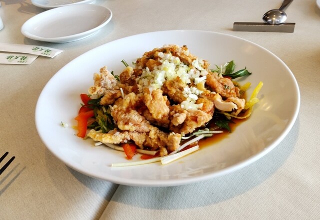 別に頼んだ油淋鶏(お店のメニューでは:若鶏もも肉の唐揚げ 油淋鶏ソース掛けと言う名前になっていたと思います。)も皮はパリパリ、肉の食感もしっかりしており、堪能できる逸品です。