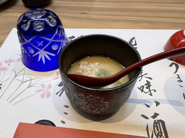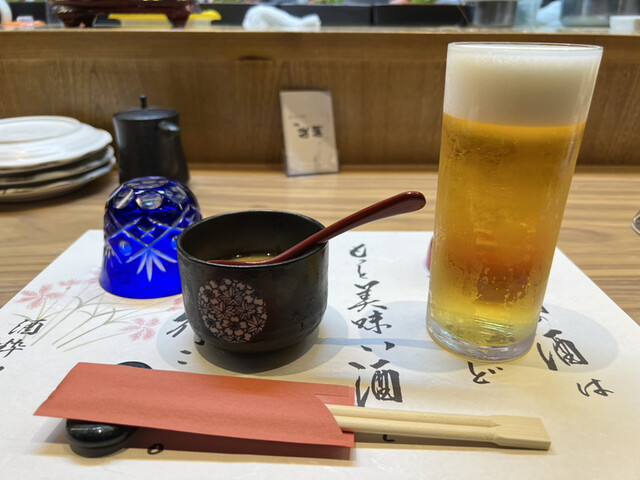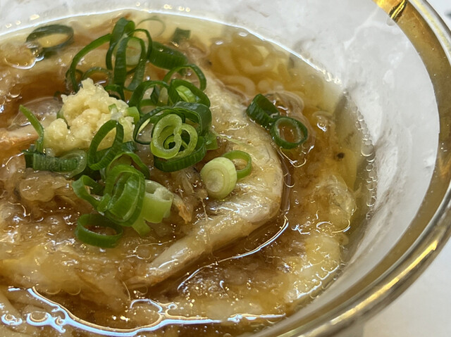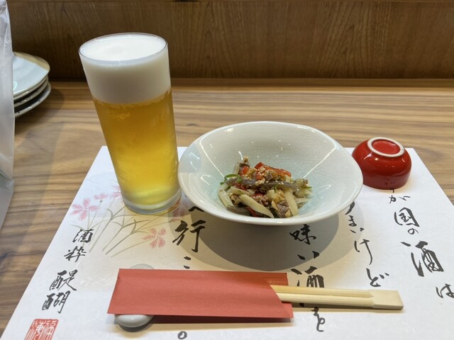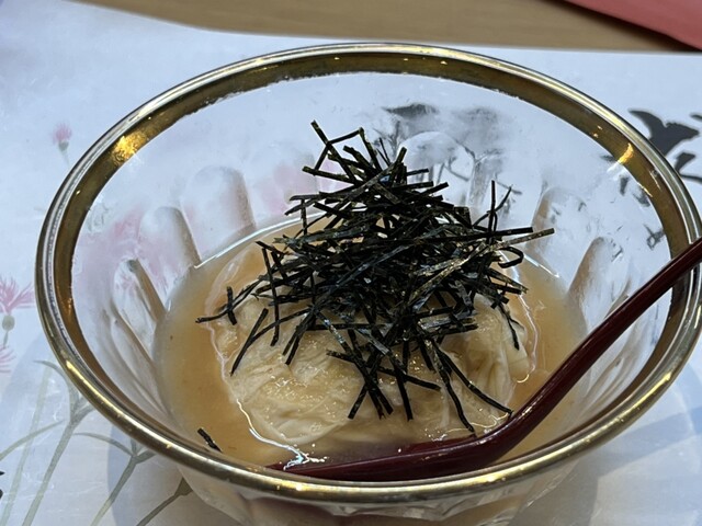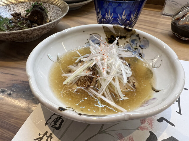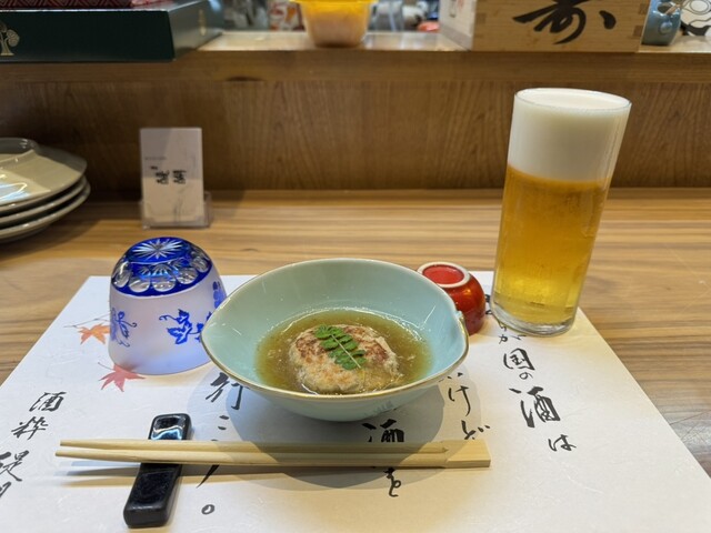 お通しは鶏つくねのお浸し❗️出汁が好みの味でもったいないからちびちびと食べることに‼️