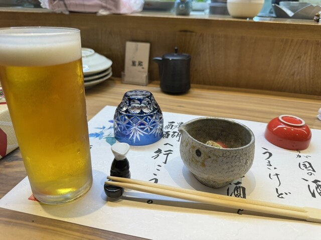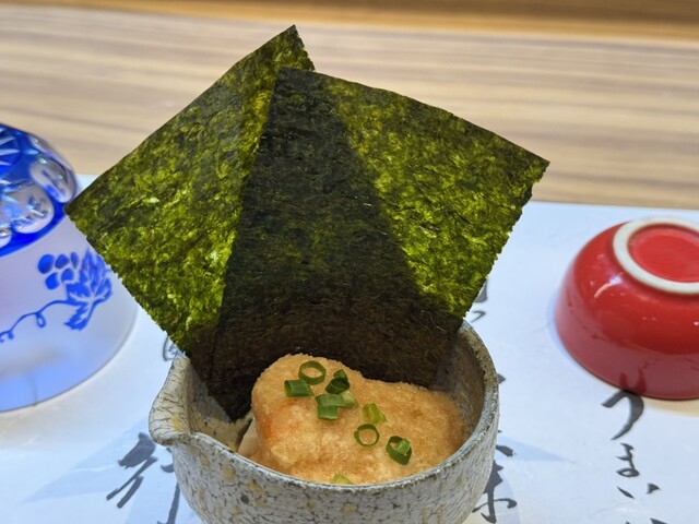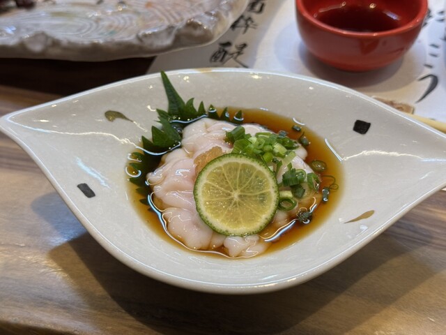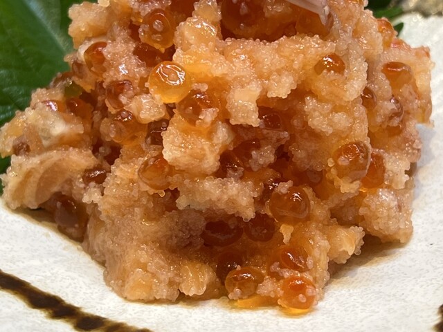 今日のお通しはホタテ、えび、タコを明太子山かけにした料理でうまうま〜