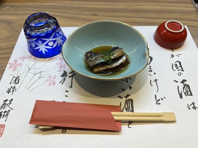 本日のお通し、のどぐろを焼いたのとなす等が入った煮浸し‼️この味付けがめちゃ好み〜