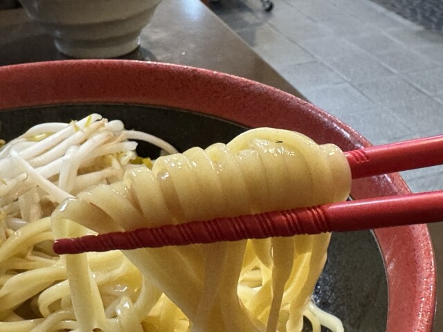 麺は平打ちでツルツル〜しかも歯応えどハマり‼️