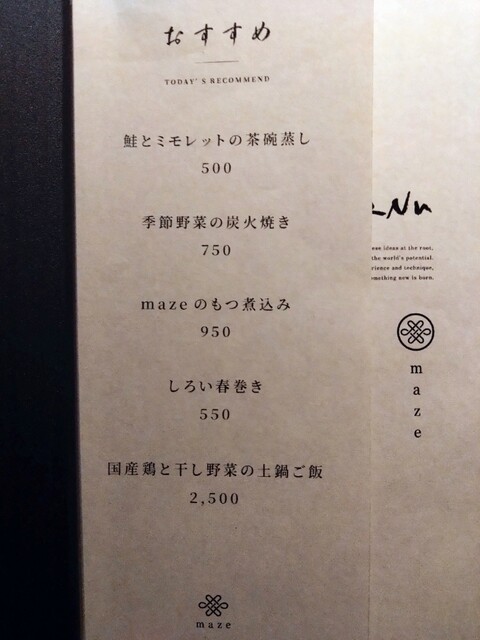 2軒目だったので、ビール2杯と、いのちの卵味噌漬け(350円)、mazeのもつ煮込み(950円)を注文。いのちの卵とは、卵のブランド名のようです。濃厚な卵の甘味に味噌の塩味がバランスよく、上品さを感じる味でした。もつ煮込みはカレー風味で驚きましたが、辛さがあり、冷えた体を温めてくれる料理でした。