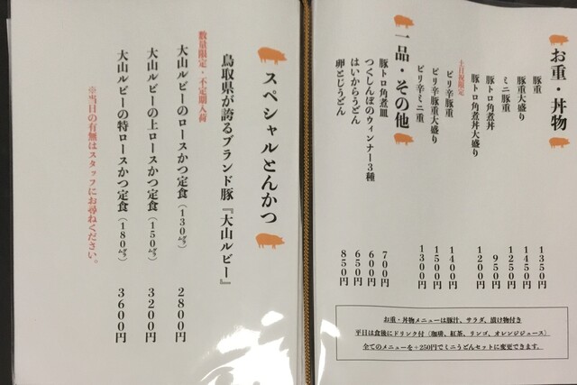 そして何とか13:00に到着し、入店しました。幸運にも3分程度待つだけで席に案内しました。注文したのは、若桜町なんて年に何回も来れないのだからということで、厚切りロースとんかつ定食にしました。平日でなかったので「極上ロースカツ定食」はなく、スペシャルの「大山ルビー」のとんかつ定食は残念ながら肉の入荷がありませんでした。これはまた来なければ...