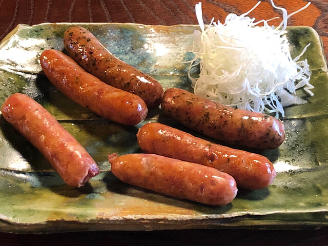 次にウインナー3種が、計6本来ました。ハーブ入り、唐辛子入り、プレーンの3種類ですが、皮はパリパリ、中はジューシーで、CMで見るように肉汁が出て来ます。1本100円程か…アリです。素材が良さすぎます。